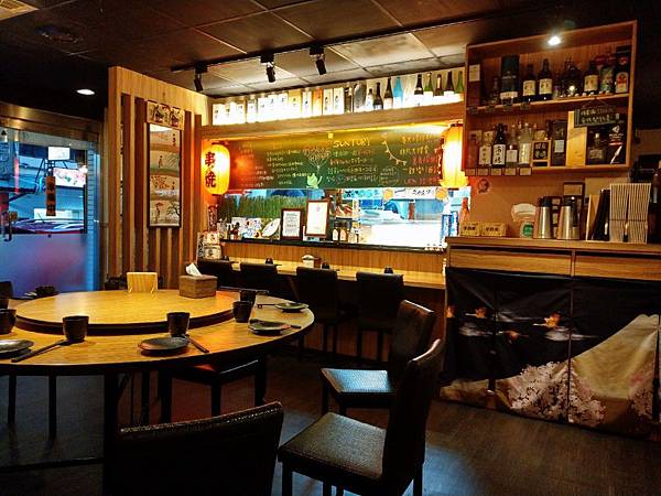 吧台區為台式風格,透明玻璃櫃呈現了當日生魚片品項。另一面牆則擺放了各式各樣的日式酒類。大門口處,僅放了一張圓桌,也是唯一的大圓桌,想必也是為家族聚餐而設置的,和樂融融,團團圓圓,圓桌亦即團圓,多溫馨的寓意呀 😍