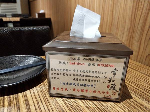 隨著現代人的習慣,手機控必備的網路,老闆當然也不會遺忘。桌上的面紙盒,清楚的寫明wifi帳密,也提醒顧客最後點餐時間🤔