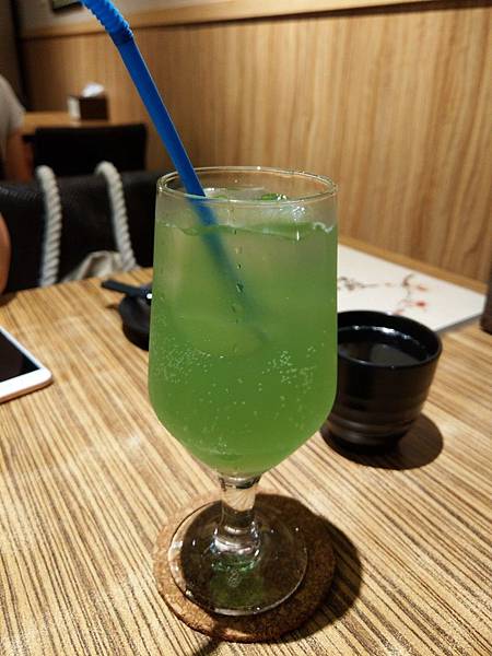 哈密瓜氣泡飲,玻璃罐裝,上桌前服務生會先換成玻璃杯。看起來美美的,喝起來甜甜的,哈密瓜味挺濃的,又不至於有化學感 😍