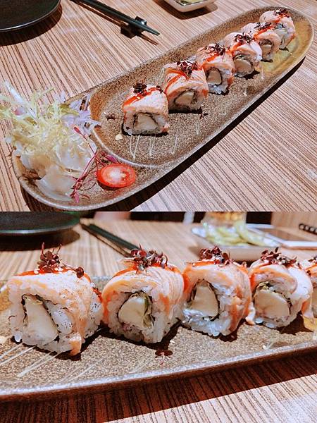 炙燒過後的鮭魚,包裹在壽司米外層,最內心夾著台灣名產香蕉。原本以為,這會是一道軟甜的料理,單純只是好奇而點,其實並不抱太大的希望。