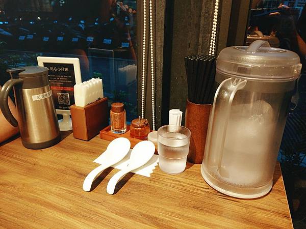 每一桌都會提供一壺冰水跟高湯,桌面上有紙巾、辣椒粉跟牙籤