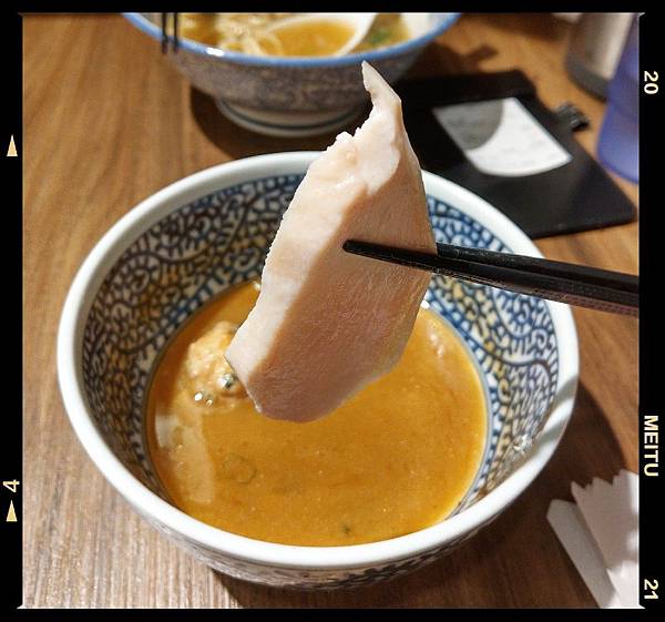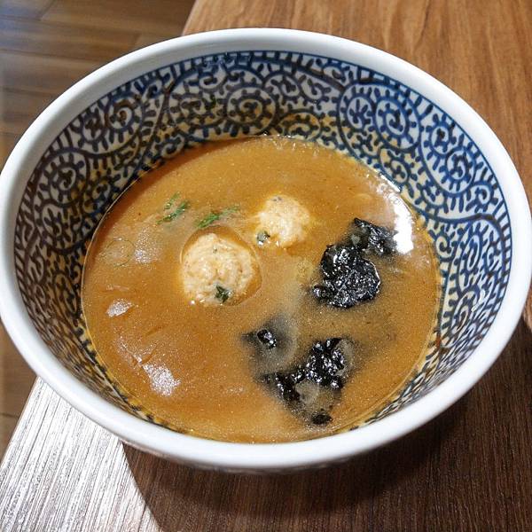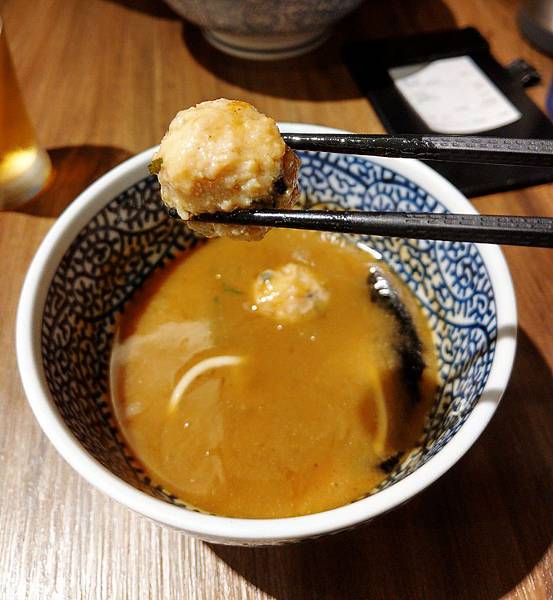沾醬內有二顆雞肉丸,用雞軟骨製作而成的丸子,帶有一點紫蘇味,搭配沾醬,味道很特別 😱