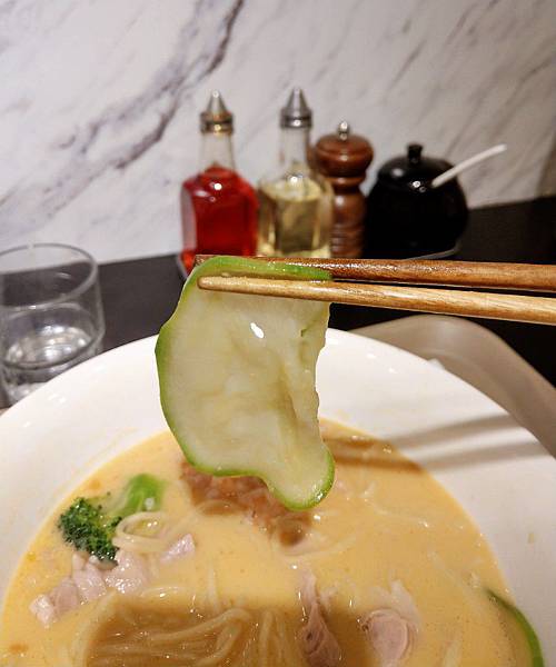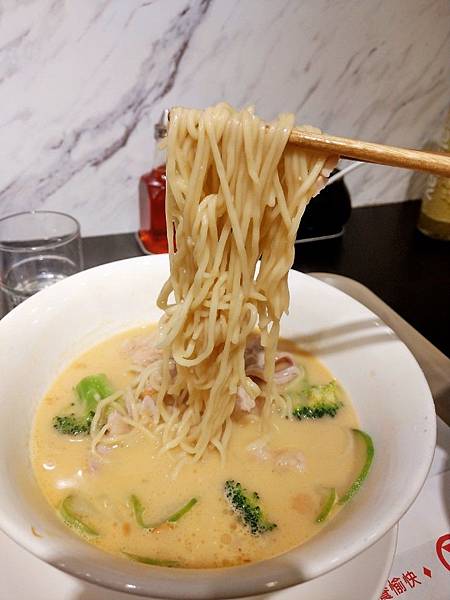 麵條咬起來很Q,份量也剛剛好,每一口都有湯汁,讓人一口接一口,就像在日本吃拉麵一樣"咻咻咻"的