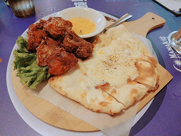 鮮嫩多汁的炸雞,烤的酥酥脆脆的薄餅,薄餅上在鋪滿一層起司,內層有奶油起司