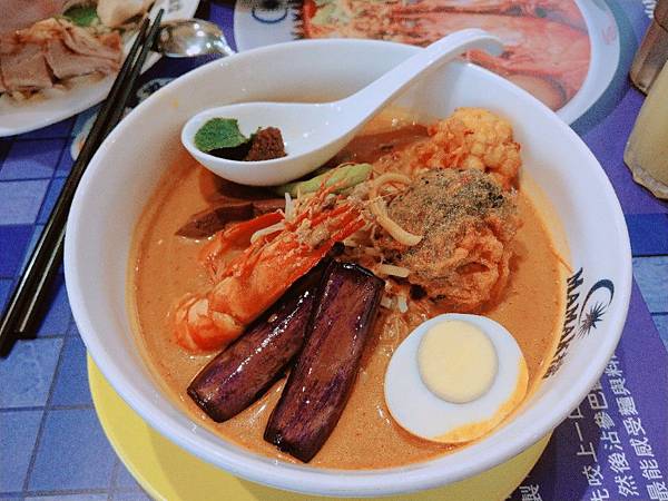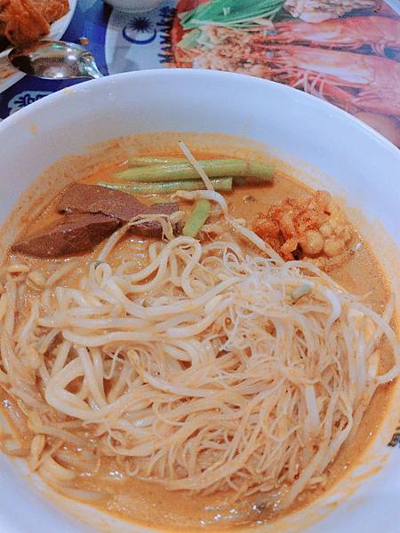 濃濃的咖哩香,大馬的Q彈麵條,新鮮的蝦子,炸花椰、茄子、水煮蛋、豆芽菜、鴨血