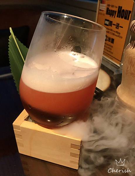 調酒擺放在一個小木盒上,裡面有乾冰,一陣一陣的白煙順著桃粉的液體往上飄,很夢幻,完全符合少女心