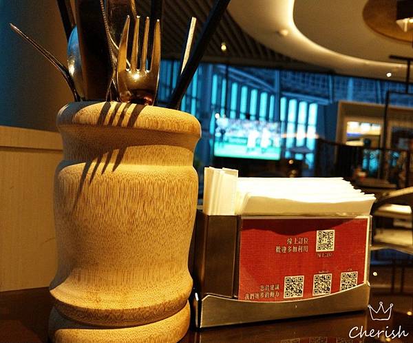 桌面上擺放了一個筷筒,依據人數已是先放入筷子、刀叉、湯匙