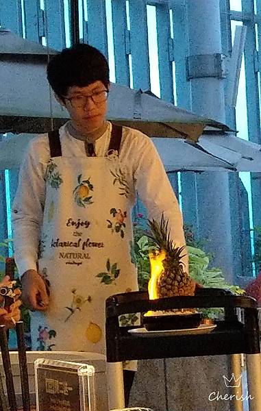 這個服務生的酒精淋灑的不太均勻,只有單邊著火。前一刻另一桌的火焰是360度燃燒,超美的
