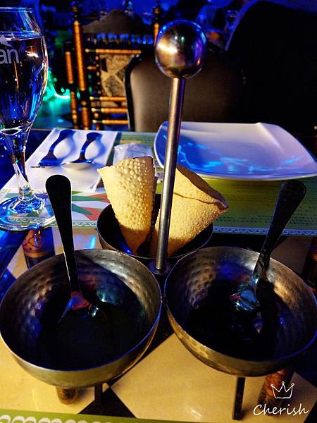 這是贈送的前菜,每一桌都有,印度脆餅,跟餅乾一樣,有二種沾醬,一個是薄荷,但不涼