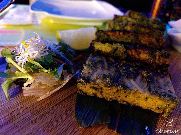 百頁豆腐醃於主廚調製的香料蔬菜醬中,放入烤爐中窯烤
