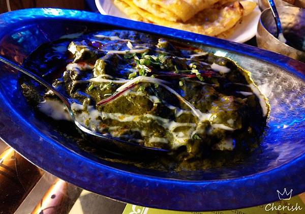去骨雞肉與旁遮普的方式及菠菜打成泥煮成,加入大蒜、辣椒....等香料小火燉製