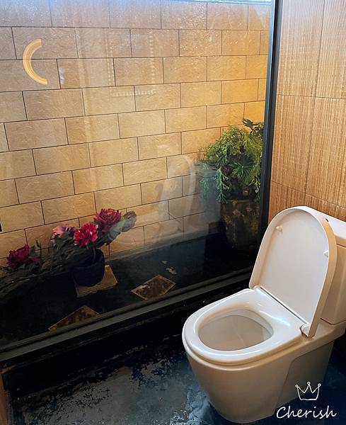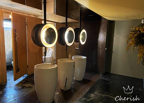 廁所也是經過設計的,擺了一大盤乾燥花,空間很大,洗手台是用吊燈開放式360度皆可使用