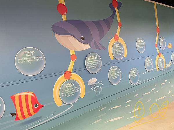 一進去就充滿色彩,牆面上寫滿了海洋知識,用詞簡單,很適合爸媽跟小朋友一邊逛街拍照,一邊上課學習![]()