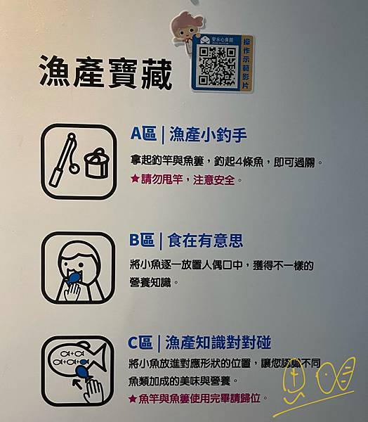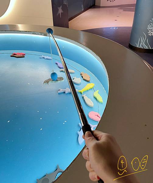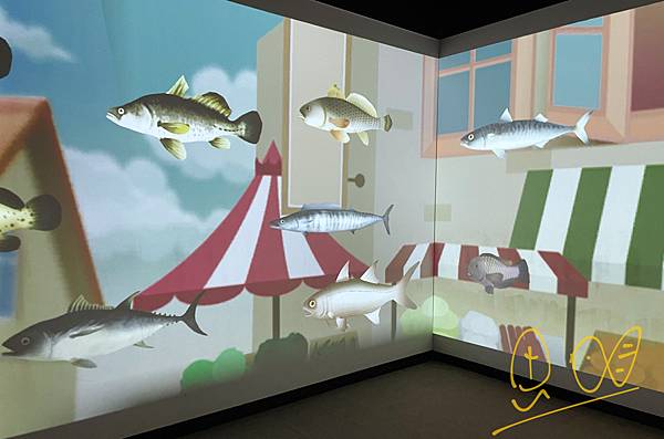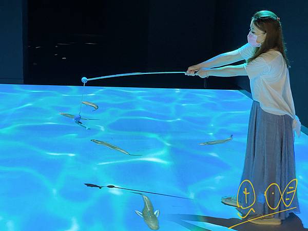 這邊是比賽抓魚的遊戲區,分成二隊,對著牆面用手抓,魚兒就會自動跑進魚樓裡喔